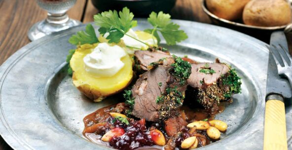 Jelení pečeně s brusinkami a mandlemi