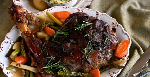 Kýtu s kostí hustě protkneme stroužky česneku a klínky anglické slaniny, potřeme olivovým olejem, osolíme, opepříme, vložíme do velkého pekáče, poklademe snítkami rozmarýnu, obložíme cibulí pokrájenou na měsíčky, podlijeme bílým vínem, zakryjeme poklicí a v troubě předehřáté na 200 °C pečeme asi 2 hodiny doměkka. Během pečení přeléváme výpekem.