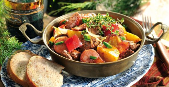 Na rozškvařené slanině zpěníme v kastrolu drobně nakrájenou cibuli, přidáme na větší kostky nakrájenou zvěřinu a ze všech stran opečeme.