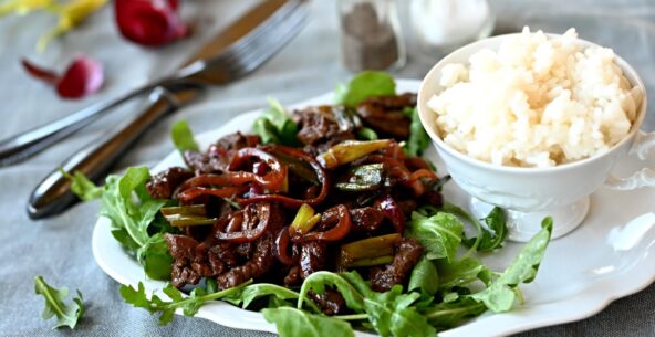 Nudličky z jelení svíčkové s karamelizovanou červenou cibulí