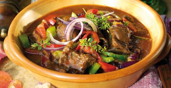 Zvěřinu nakrájíme na větší kostky, osolíme, opepříme a obalíme v hladké mouce. Na sádle rozškvaříme slaninu nakrájenou na drobné kostičky, přidáme nakrájené bílé cibule a necháme zesklovatět. Poté vložíme zvěřinu a ještě chvíli mícháme a opékáme.