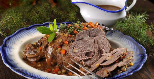 Srnčí kýtu odblaníme, protáhneme klínky slaniny (část slaniny si odložíme stranou), potřeme ze všech stran citronovou šťávou, drceným pepřem a solí a dáme do chladu přes noc rozležet.