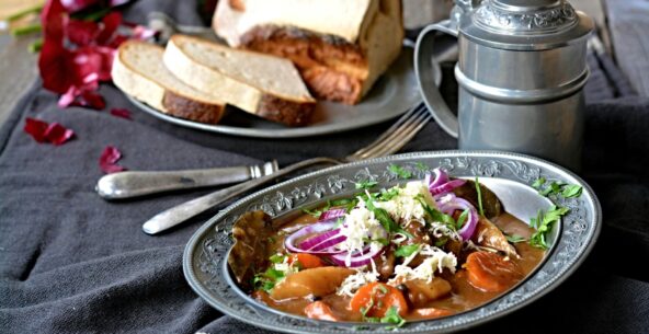 Jednotlivé porce zdobíme kopečkem zakysané smetany a snítkou čerstvého koriandru nebo plocholisté petržele, podáváme s dýňovým houskovým knedlíkem.
