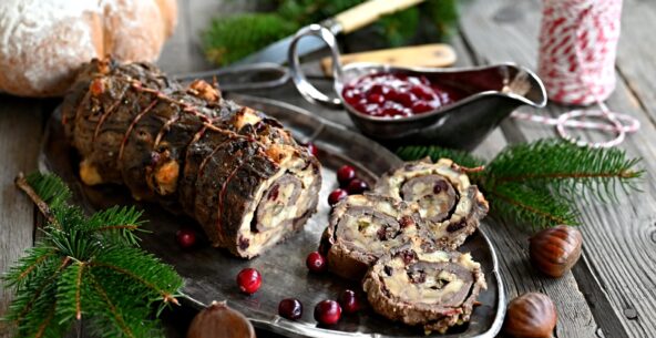 Sváteční jelení roláda s jedlými kaštany a brusinkami