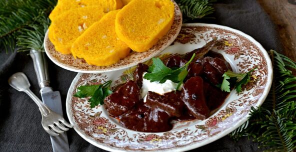 Pod poklicí zvolna dusíme asi hodinu, až je zvěřina téměř měkká. Tehdy přidáme na kostky nakrájené brambory a dusíme ještě asi 10 minut.