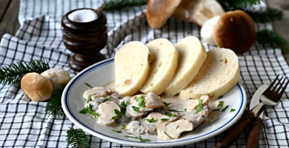 Jelení kýtu nakrájíme na plátky, okraje nařízneme, naklepeme, osolíme, lehce posypeme kořením a obalíme v mouce. Hříbky též nakrájíme na plátky. V pánvi na rozehřátém oleji opékáme plátky obalené kýty z každé strany asi 3 až 4 minuty, odložíme stranou.