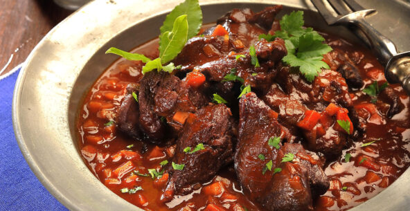 Důkladně odblaněnou a šlach zbavenou zvěřinu rozdělíme na větší kousky, osolíme, opepříme a posypeme rozemnutým tymiánem. Očistěnou zeleninu a cibuli nakrájíme na kostičky.