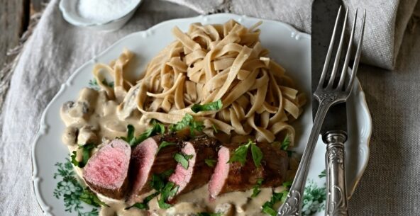 Důkladně odblaněný jelení hřbet přes vlákno nakrájíme na špalíky, mírně je rukou sevřenou v pěst zploštíme na medailonky, posypeme kořením, osolíme a v pokojové teplotě necháme asi 15 minut odležet.