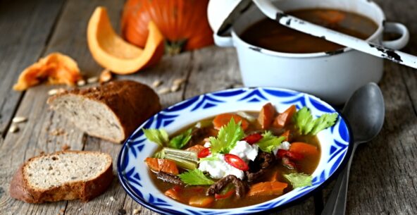 Odblaněnou daňčí plec nakrájíme na nudličky, vložíme do misky, osolíme, posypeme polovinou směsi mletého koření a promícháme. Dýni se slupkou zbavenou semínek a měkké dužniny, očištěnou mrkev a stonky řapíkatého celeru nakrájíme na větší kousky, chilli papričku zbavenou semínek a šalotku nadrobno, česnek na plátky.