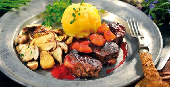 Daňčí medailonky s restovanými hříbky a švestkovým přelivem