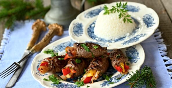 Odblaněnou daňčí kýtu nakrájíme na plátky a rozklepeme je na velmi tenkou stejnoměrnou tloušťku. Rozklepané plátky nakrájíme na proužky o rozměrech 6 x 12 cm, z obou stran je osolíme a lehce posypeme kořením. Papriky nakrájíme na tenké proužky, šalotky na měsíčky.