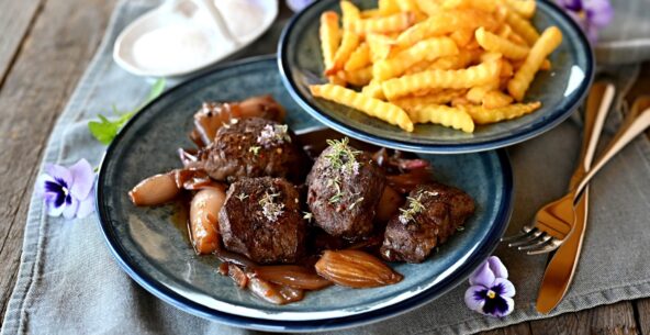 Důkladně odblaněný jelení hřbet přes vlákno nakrájíme na špalíky, mírně je rukou sevřenou v pěst zploštíme na medailonky, posypeme kořením, osolíme a v pokojové teplotě necháme asi 15 minut odležet.