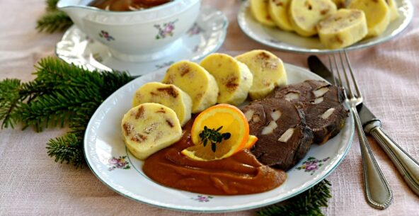 Důkladně odblaněnou dančí kýtu opláchneme studenou vodou, osušíme, prošpikujeme klínky slaniny, ze všech stran osolíme, posypeme mletým zvěřinovým kořením, tenkým provázkem pevně svážeme do válečku a odložíme.